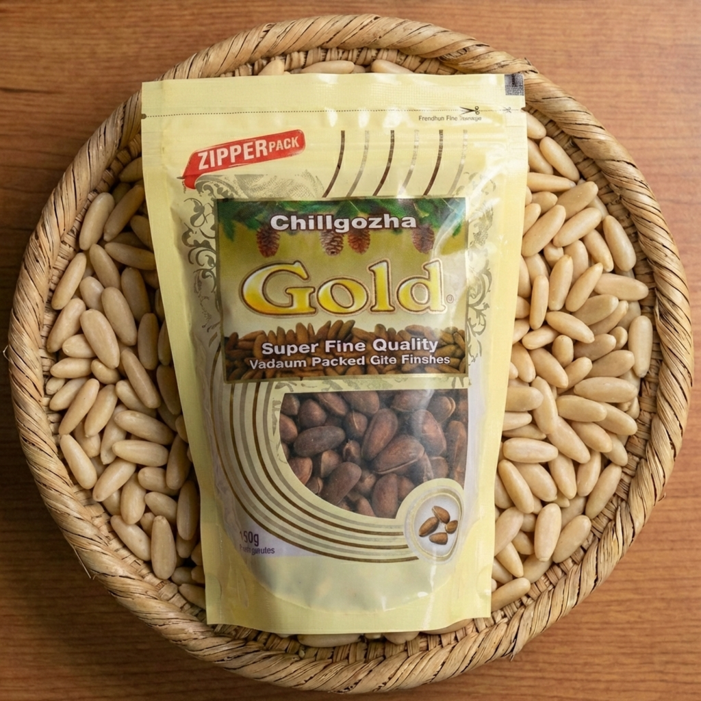Premium Gold brand pine nuts, available with shell (200g and 500g) and without shell (200g), perfect for cooking, baking, or snacking.